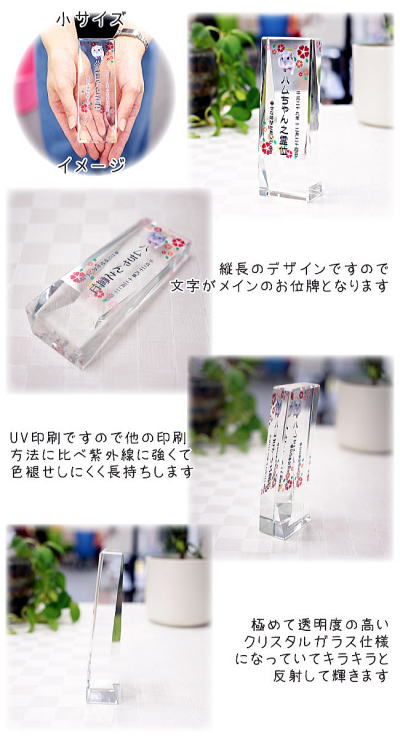 SERVICE レーザー彫刻はガラスの中に彫刻いたします。 UVカラー印刷はカラー写真を印刷できます。 KP-23A(大) W65mm・H180mm・D40mm UVカラー印刷24,200円 レーザー彫刻 24,200円 KP-23B(中) W60mm・H160mm・D35mm UVカラー印刷21,780円 レーザー彫刻 21,780円 KP-23C(小) W50mm・H140mm・D30mm UVカラー印刷19,360円 レーザー彫刻 19,360円 仏具・具足は こちら ※詳しくはお問い合わせください → こちらへ